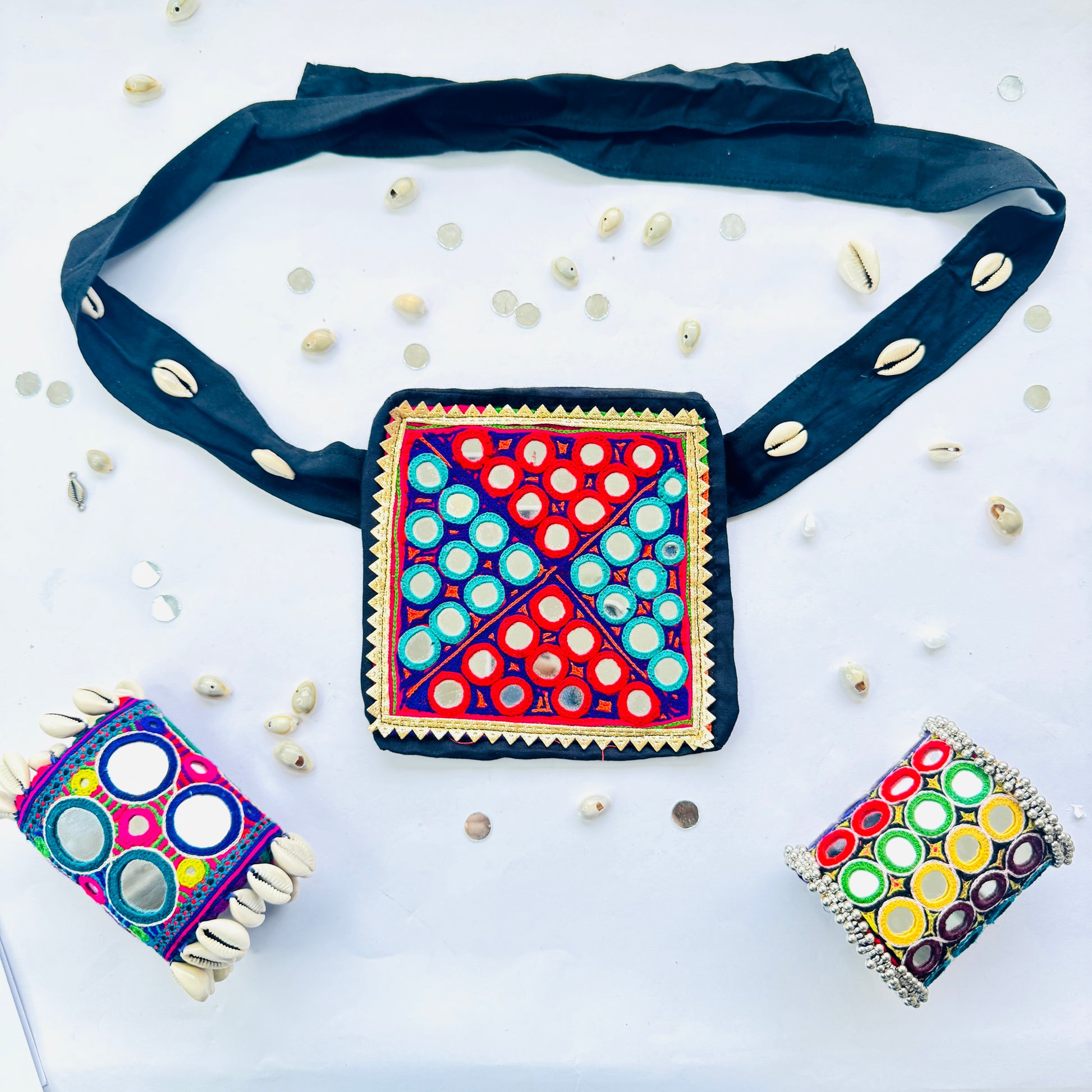 Celebrate Navratri with style and tradition using our Navratri Vintage Mobile Belt. This elegantly designed belt is perfect for carrying your mobile phone securely while you garba and revel in the festive spirit. Made from exquisite vintage Pachis fabric, renowned for its rich textures and vibrant colors, this belt not only serves a practical purpose but also adds a touch of heritage to your attire. Each belt is a unique, single piece, ensuring you have a one-of-a-kind accessory for your celebrations.