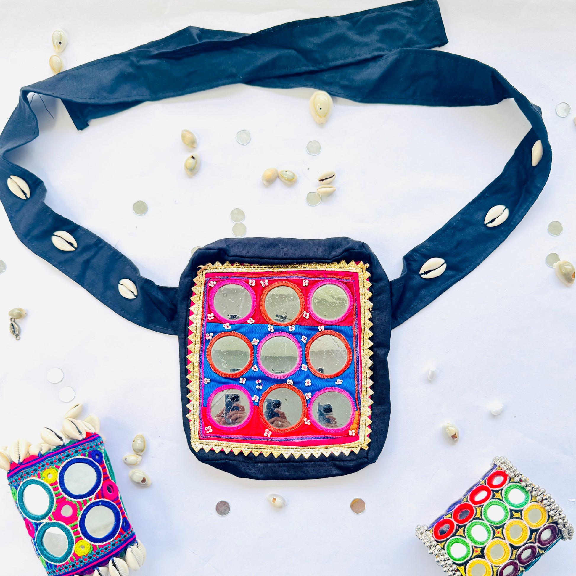 Celebrate Navratri with style and tradition using our Navratri Vintage Mobile Belt. This elegantly designed belt is perfect for carrying your mobile phone securely while you garba and revel in the festive spirit. Made from exquisite vintage Pachis fabric, renowned for its rich textures and vibrant colors, this belt not only serves a practical purpose but also adds a touch of heritage to your attire. Each belt is a unique, single piece, ensuring you have a one-of-a-kind accessory for your celebrations.